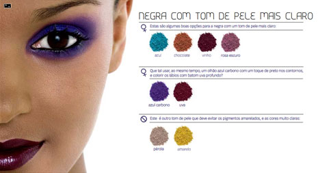 Berinjela, vermelho fechado, grafite, vinho, uva, azul profundo, rosa escuro e bordô são as cores mais indicadas para negras de pele bem escura. Já as miscigenadas, com tom puxado para o marrom, se dão bem com chocolate, dourado, bronze, cobre ou o próprio marrom. Batons e sombras com resultado metálico deixam a maquiagem mais viva, as texturas foscas realçam o contorno e trazem naturalidade.